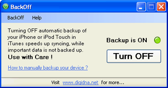 BackOff is een klein programmaatje dat het maken van reservekopieën met je iDevice (iPhone, iPod of iPad) tijdelijk stopzet. Synchroniseer je geregeld je iPhone met je computer (via iTunes) dan weet je hoe lang dit soms duurt. BackOff is gratis en bestaat vrijwel alleen uit een aan- en uitknop voor dit proces.