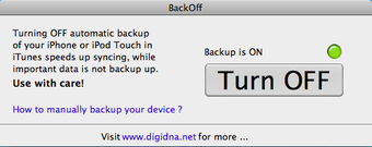 BackOff is een klein programmaatje dat het maken van reservekopieën met je iDevice (iPhone, iPod of iPad) tijdelijk stopzet. Synchroniseer je geregeld je iPhone met je computer (via iTunes) dan weet je hoe lang dit soms duurt. BackOff is gratis en bestaat vrijwel alleen uit een aan- en uitknop voor dit proces.